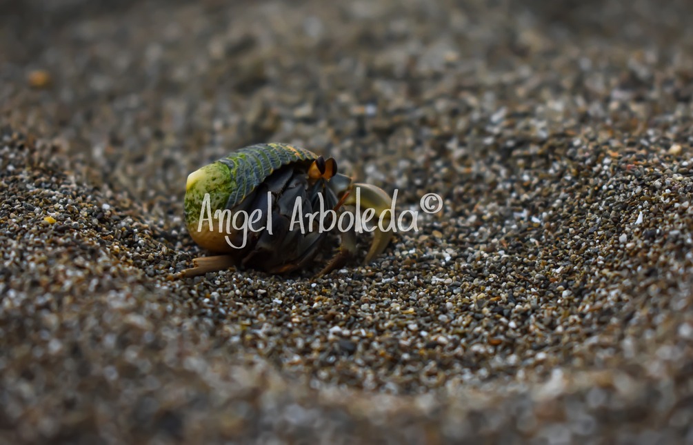 Coenobita compressus: These beach crabs use their last two legs to hold the shell that protects their fragile abdomen, they live in small holes they dig in the sand. This picture was taken in Bahia Solano, Choco and it was amazing to see that there are thousands of them along the beach, we had to walk very carefully to avoid stepping on any of them.